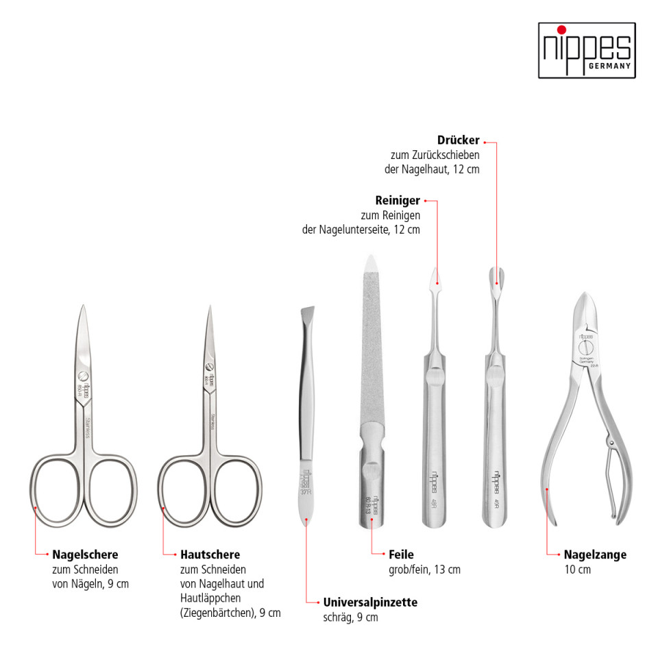 Trusa de manichiura Nippes Premium Quality 1006 contine 7 instrumente din otel inoxidabil de cea mai inalta calitate: